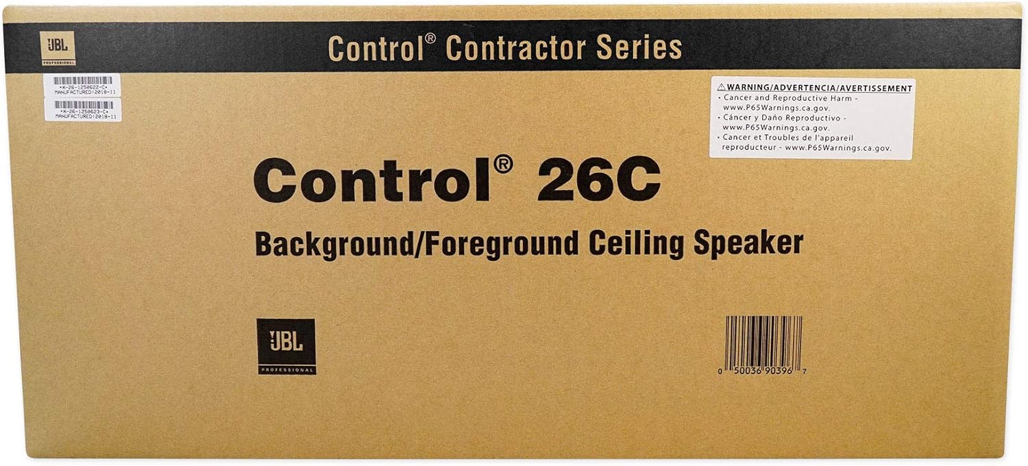 Introducing the JBL Professional Control 26C In-Ceiling Speaker, your ultimate solution for premium performance music systems in whole-house audio setups, restaurants, and retail environments. Great for background music, or foreground music. With its 16-ohm impedance, you can easily use multiple speakers in parallel without needing a costly constant voltage distributed system. The 6.5” woofer, featuring a polyurethane-coated cone and butyl rubber surround, ensures long-lasting durability and exceptional sound quality. The Control 26C is designed to deliver a warm and smooth bass response thanks to its computer-optimized ported enclosure. For additional bass, add a Control series subwoofer to the system. The aluminum voice coil former provides efficient cooling, allowing for long-term power handling. For those crisp, clear highs, the speaker is equipped with a ¾” titanium-coated tweeter. With its broad 110° coverage pattern, you can reduce system costs by using fewer speakers without compromising performance, making it an ideal choice for any space. One of the standout features of the Control 26C is the JBL SonicGuard overload protection, which ensures reliable, full-fidelity sound without audible distortion. This speaker comes packaged with a grille, back-can, and tile rails for fast and seamless installations. Plus, the white grille is paintable, allowing you to match it perfectly with your décor. Sold as a pair, the JBL Professional Control 26C In-Ceiling Speaker is not only a robust and high-quality addition to your audio system but also a cost-effective solution that promises longevity and exceptional audio performance. Whether you're setting up a home theater or enhancing the ambiance in a commercial space, these speakers are designed to meet your needs with excellence. Sold as Pair.
