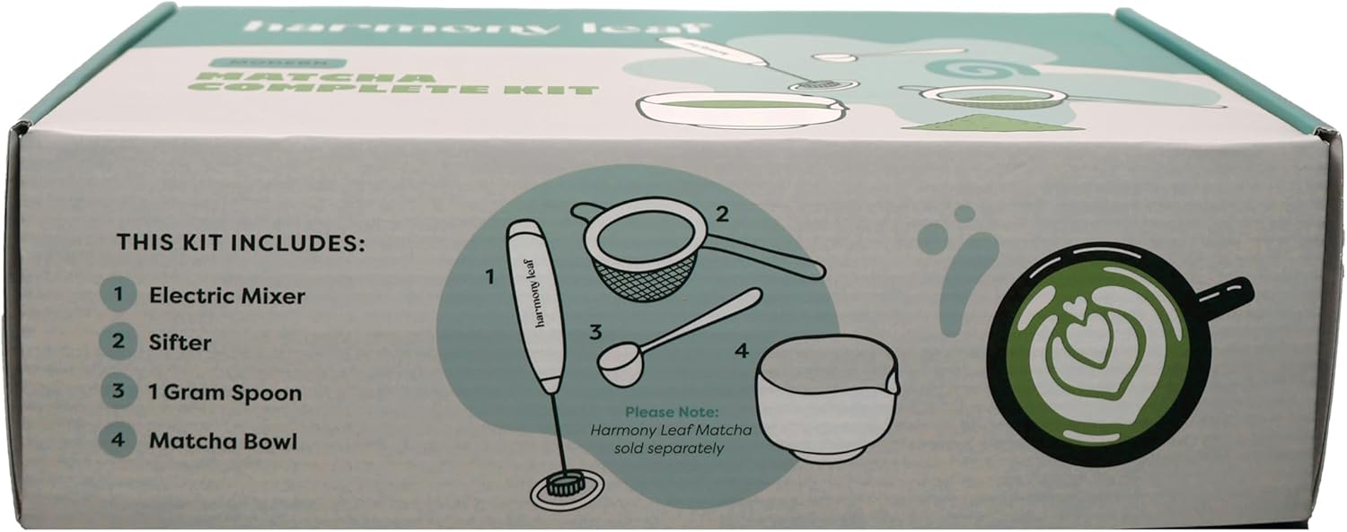 What It IsThe Harmony Leaf Modern Matcha Complete Kit includes a stainless steel sifter, a precision matcha scoop, a ceramic matcha bowl with a pour spout, and an electric milk frother. It is designed for smooth, consistent matcha at home.Why It WorksThe sifter removes clumps, the scoop ensures accuracy, the ceramic bowl provides an ideal whisking surface, and the frother blends matcha quickly and evenly. Combined, these tools create a simple and reliable matcha process.How to Use ItSift matcha into the bowl, measure one to two scoops, add hot water, and blend using the frother. Pour directly into your cup using the bowl's spout. Adjust strength or sweetness as desired.Why People Love ItThis modern set offers a clean, minimal approach to matcha preparation. It is organized, easy to use, and makes preparing matcha a simple part of daily routines.